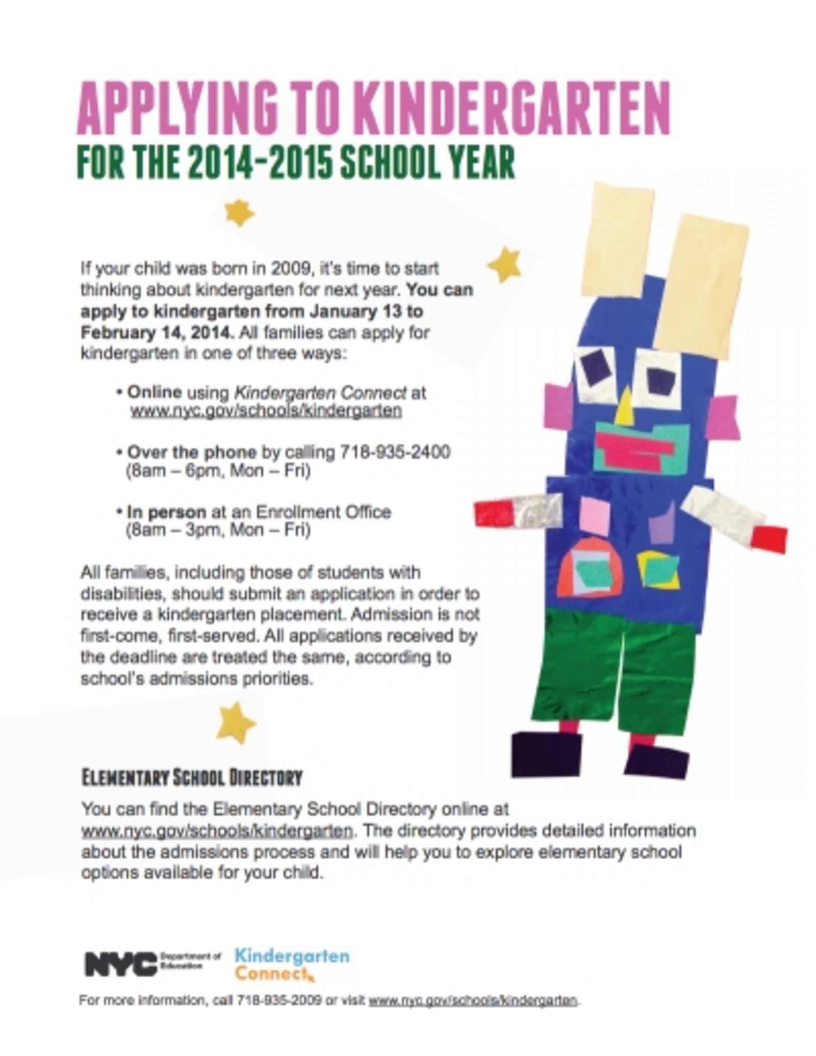Families will have just one month to use the new online system to apply to kindergarten for 2014, according to admissions dates posted by the Department of Education today. Parents of children born in 2009 may apply online, on the phone to a central DOE number or in person at an enrollment office between Jan. 13-Feb.14. Not only is the online admissions process, called Kindergarten Connect, a change from previous years, but the application period is earlier and shorter. Last year families applied in person at schools between Jan. 22- March 1.