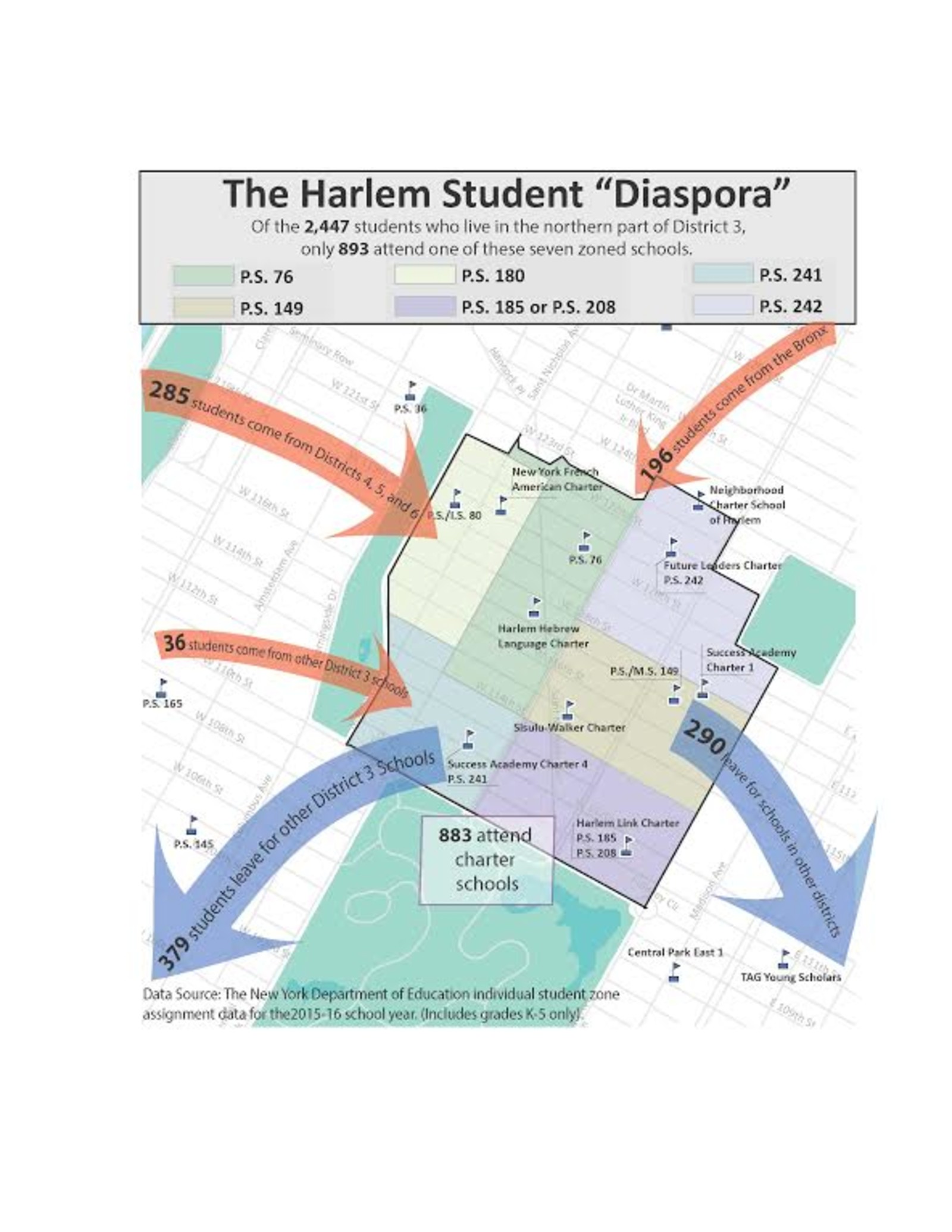 Stand on the corner of 116th Street and Lenox Avenue in Harlem early on a school day morning, and you'll see a steady stream of children leaving the neighborhood by bus and subway. Some parents call this daily exodus the "Harlem diaspora." They may live in the neighborhood, but they don't necessarily send their children to their zoned neighborhood schools.
