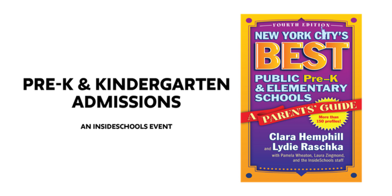 The event is free but you must RSVP. A $20 ticket includes a copy of our book: New York City’s Best Public Pre-K and Elementary Schools, 4th Edition. This guide, based on our visits to more than 150 schools in all five boroughs, has critical information on "who gets in," the quality of teaching, dual language programs, special education services--and more. This special offer is a 30 percent discount off the list price of $29.95.