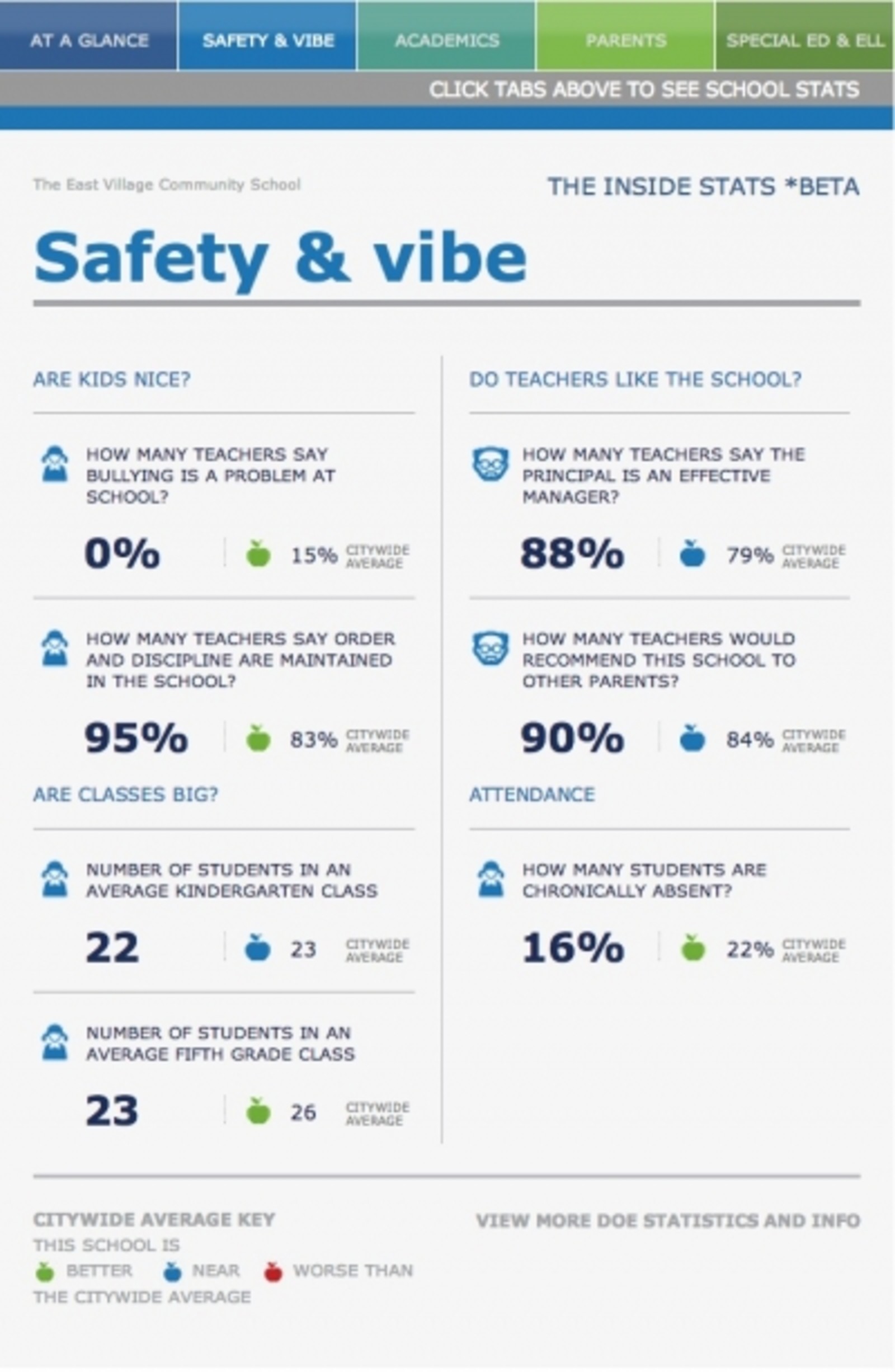 Now, just in time for the Feb.14 deadline to apply to kindergarten, we've got the answers to those questions for 735 public elementary schools, including charters. Our new feature, called Insidestats, presents easy-to-read data on elementary schools on each school's profile page. For example, you can see that at popularPS 321 in Park Slope, 97 percent of the teachers think the principal is a good manager.