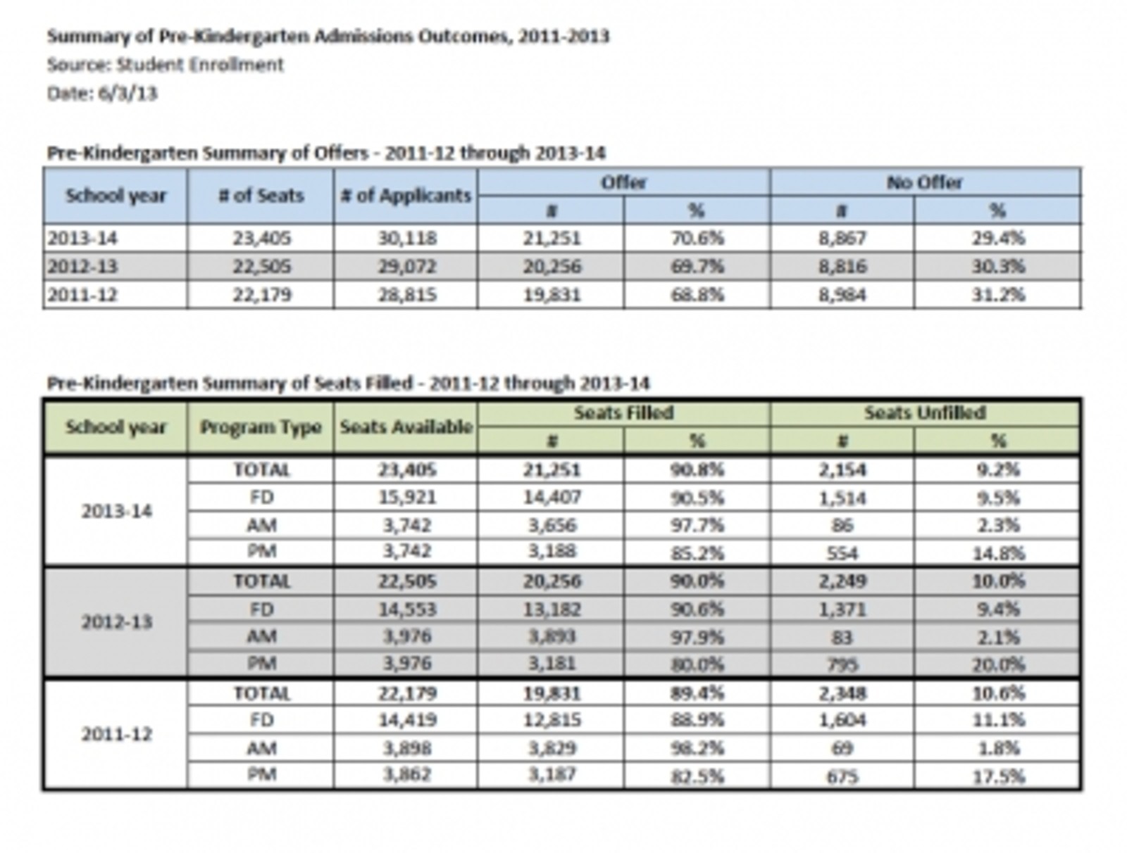 This spring, 30,118 kids applied for 23,405 full and half-day seats in public schools and 29.4 percent of them did not get an offer. That percentage is slightly lower than last year, when 30.3% did not get pre-k offers for school-based programs.
